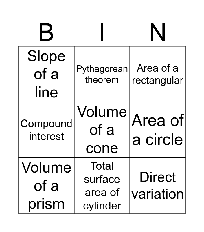 This bingo card has a free space and 8 words: Area of a circle, Area of a rectangular, Pythagorean theorem, Volume of a prism, Slope of a line, Direct variation, Compound interest and Total surface area of cylinder.