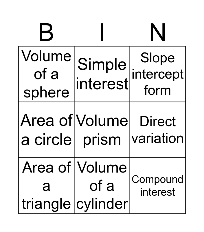 This bingo card has 9 words: Area of a triangle, Slope intercept form, Simple interest, Area of a circle, Volume of a sphere, Direct variation, Volume prism, Compound interest and Volume of a cylinder.