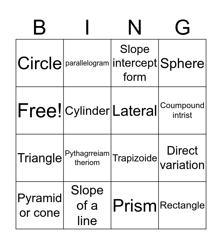 This bingo card has 16 words: Slope of a line, Direct variation, Slope intercept form, Circle, Triangle, parallelogram, Trapizoide, Prism, Free!, Cylinder, Pyramid or cone, Sphere, Pythagrreiam theriom, Coumpound intrist, Lateral and Rectangle.
