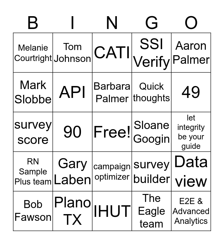 This bingo card has a free space and 24 words: Gary Laben, Plano TX, Barbara Palmer, Bob Fawson, Aaron Palmer, Melanie Courtright, Mark Slobbe, Tom Johnson, Sloane Googin, campaign optimizer, Quick thoughts, survey score, survey builder, Data view, API, The Eagle team, let integrity be your guide, CATI, 49, 90, E2E & Advanced Analytics, RN Sample Plus team, SSI Verify and IHUT.