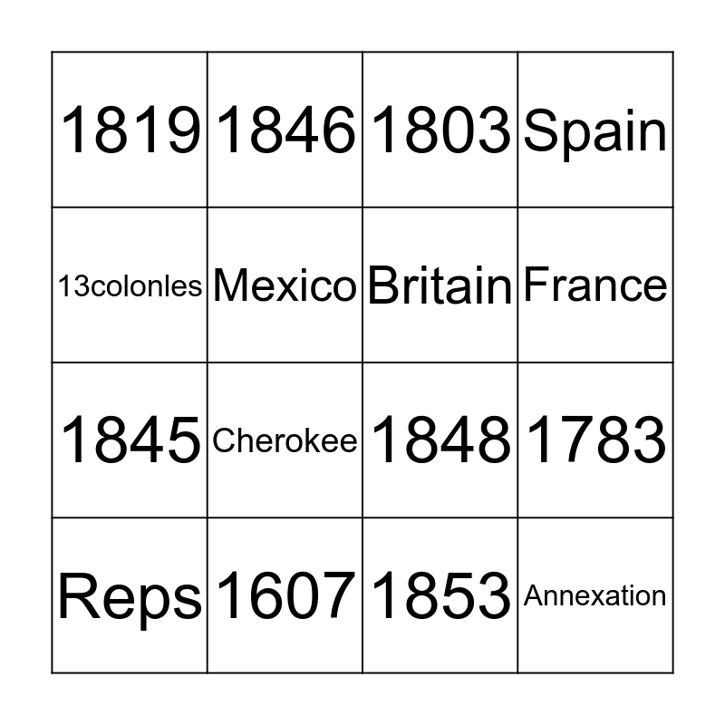 This bingo card has 16 words: 1607, 1783, 1803, 1819, 1845, 1846, 1848, 1853, 13colonles, Mexico, Reps, Spain, Cherokee, France, Britain and Annexation.