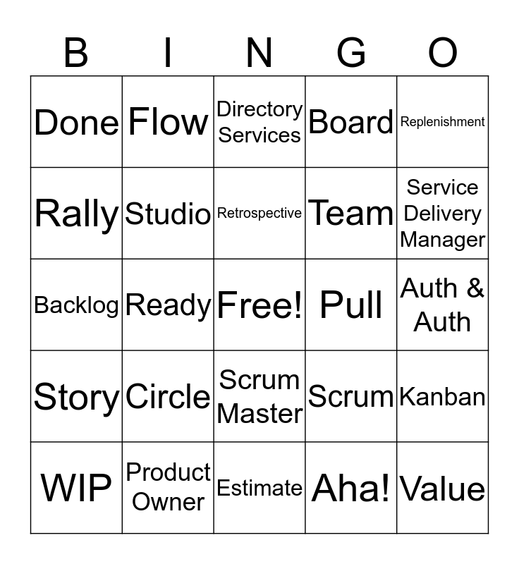 This bingo card has a free space and 24 words: Circle, Product Owner, Retrospective, WIP, Replenishment, Done, Rally, Flow, Pull, Scrum Master, Team, Backlog, Scrum, Kanban, Studio, Aha!, Auth & Auth, Directory Services, Service Delivery Manager, Ready, Value, Story, Board and Estimate.