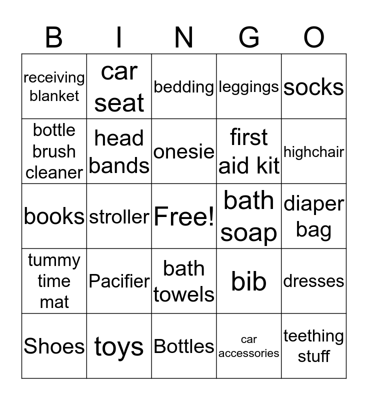 This bingo card has a free space and 25 words: Pacifier, Bottles, onesie, Shoes, socks, receiving blanket, bottle brush cleaner, car seat, bath soap, bath towels, first aid kit, books, bib, dresses, head bands, wipes, diaper bag, bedding, highchair, stroller, teething stuff, toys, tummy time mat, leggings and car accessories.