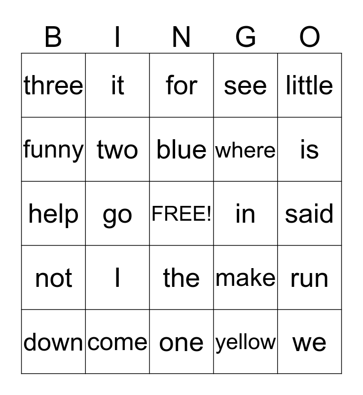 This bingo card has a free space and 24 words: I, come, blue, down, little, three, funny, it, in, the, where, help, make, run, two, yellow, said, for, is, go, we, not, see and one.