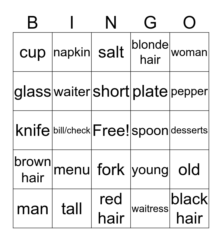 This bingo card has a free space and 24 words: menu, tall, short, man, woman, cup, glass, napkin, spoon, fork, plate, knife, young, old, waiter, waitress, desserts, salt, pepper, bill/check, black hair, brown hair, blonde hair and red hair.
