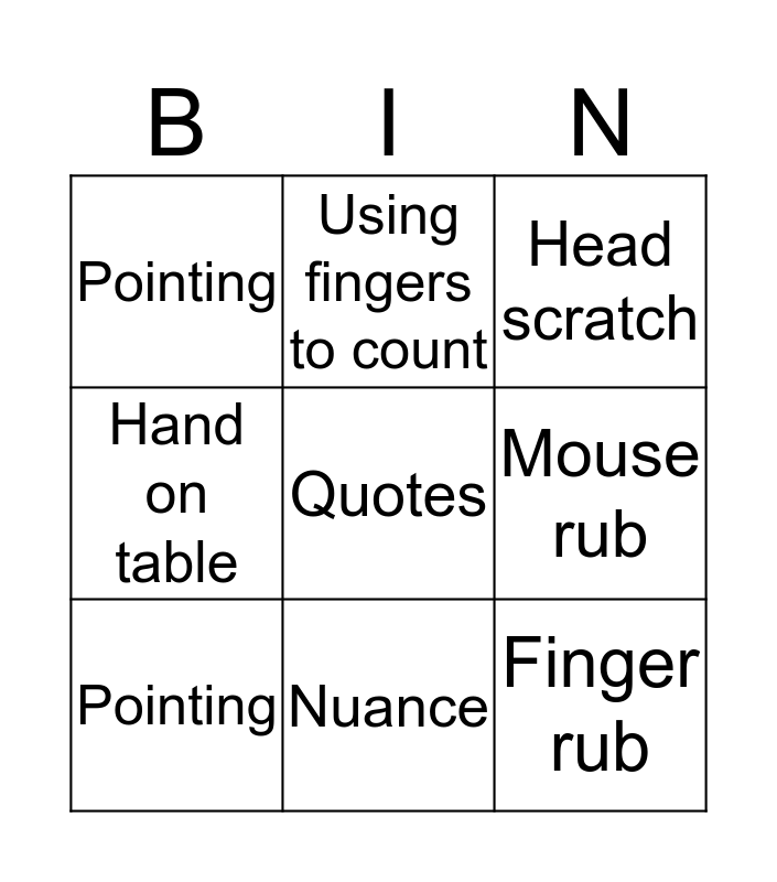 This bingo card has 11 words: Finger rub, Nuance, Quotes, Pointing, Using fingers to count, Head scratch, Mouse rub, Looking pained, Hand on table, Pointing and Head scratch.