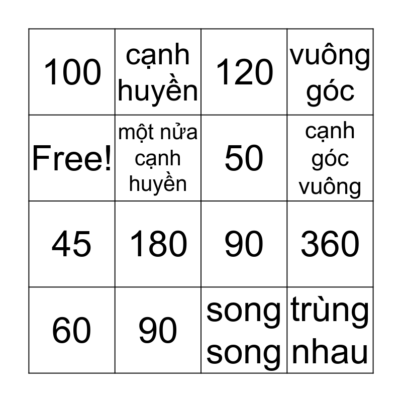 This bingo card has 16 words: 90, 360, 120, 100, 45, cạnh huyền, 90, song song, Free!, một nửa cạnh huyền, 60, vuông góc, 180, cạnh góc vuông, 50 and trùng nhau.