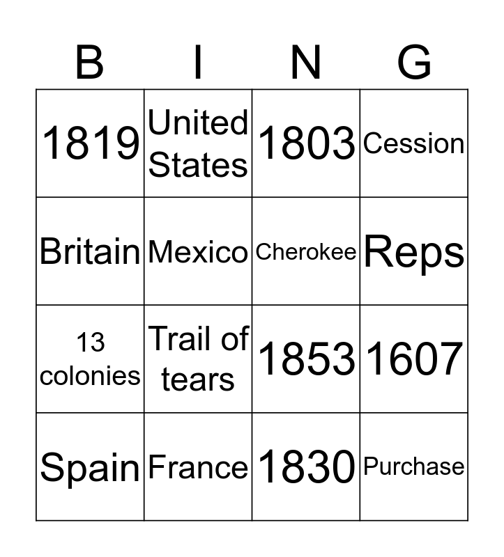 This bingo card has 16 words: France, 1607, 1803, 1819, 13 colonies, United States, 1853, 1830, Britain, Mexico, Spain, Cession, Trail of tears, Reps, Cherokee and Purchase.
