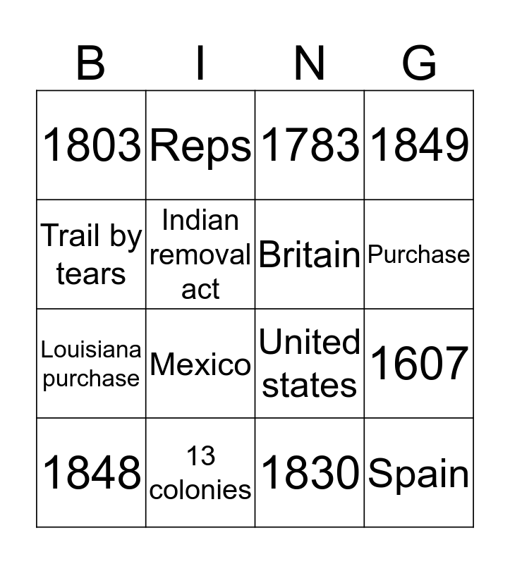 This bingo card has 16 words: 13 colonies, 1607, 1783, 1803, Louisiana purchase, Reps, United states, 1830, Trail by tears, Indian removal act, 1848, 1849, Mexico, Purchase, Britain and Spain.