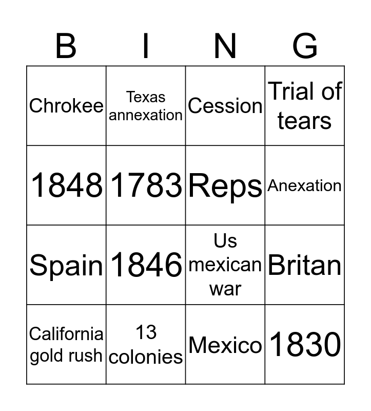 This bingo card has 16 words: 13 colonies, Britan, Cession, Chrokee, Spain, Texas annexation, Us mexican war, Mexico, 1848, 1783, California gold rush, Trial of tears, 1846, Anexation, Reps and 1830.