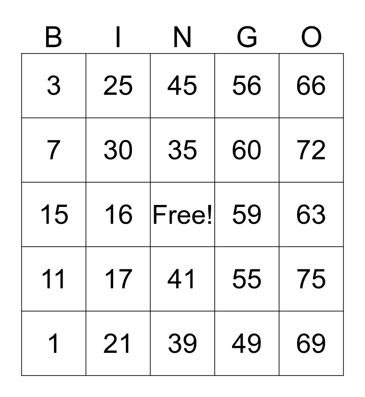 This bingo card has a free space and 24 words: 1, 17, 35, 49, 66, 3, 25, 45, 59, 63, 15, 30, 55, 75, 7, 21, 39, 56, 72, 11, 16, 41, 60 and 69.