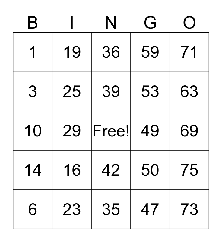 This bingo card has a free space and 24 words: 6, 16, 39, 47, 71, 1, 19, 36, 49, 69, 10, 25, 50, 75, 3, 23, 35, 59, 63, 14, 29, 42, 53 and 73.