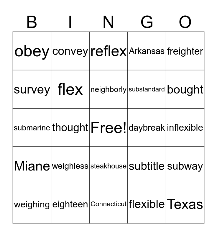This bingo card has a free space and 24 words: weighless, eighteen, neighborly, weighing, freighter, obey, survey, convey, daybreak, steakhouse, substandard, submarine, subtitle, subway, flex, flexible, inflexible, reflex, bought, thought, Texas, Miane, Arkansas and Connecticut.