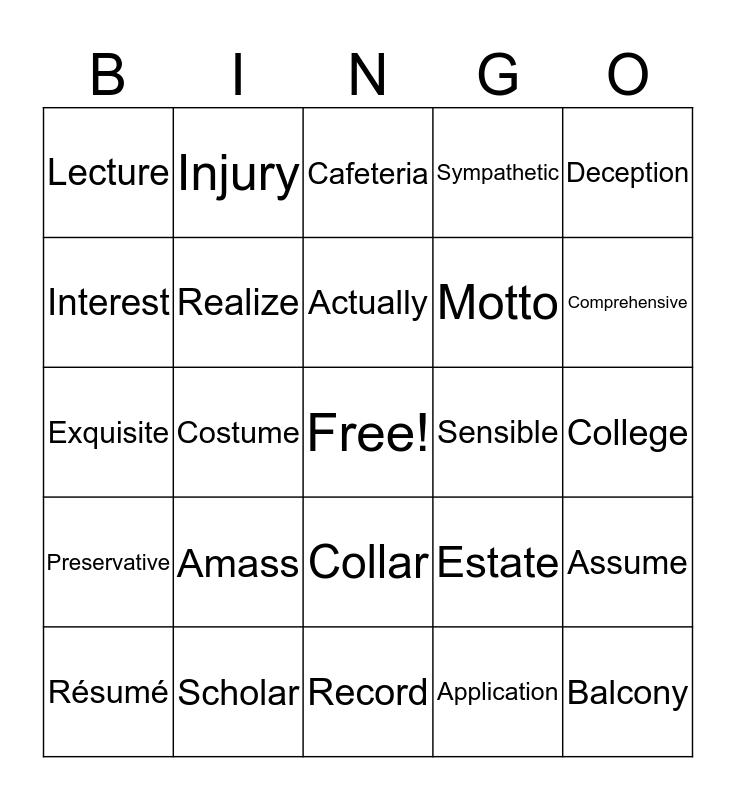 This bingo card has a free space and 42 words: Actual, Actually, Agenda, Amass, Application, Assume, Balcony, Beef, Cafeteria, Collar, College, Comprehensive, Costume, Deception, Educated, Estate, Eventually, Exquisite, Fabric, Injury, Interest, Intoxication, Journal, Lecture, Legend, Lunch, Motto, Novel, Parent, Pasta, Prejudice, Preservative, Realize, Record, Resume, Résumé, Scholar, Sensible, Spouse, Support, Sympathetic and Tax.