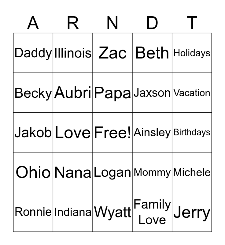 This bingo card has a free space and 24 words: Nana, Indiana, Papa, Ronnie, Holidays, Daddy, Becky, Illinois, Ainsley, Logan, Jaxson, Jakob, Mommy, Michele, Aubri, Family Love, Birthdays, Zac, Vacation, Love, Jerry, Ohio, Beth and Wyatt.