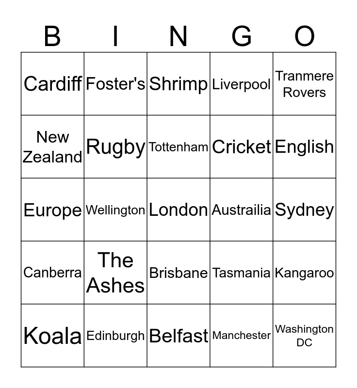 This bingo card has a free space and 24 words: The Ashes, Edinburgh, Tottenham, Koala, Tranmere Rovers, Cardiff, New Zealand, Foster's, Austrailia, Brisbane, Cricket, Europe, Tasmania, Kangaroo, Rugby, Manchester, Sydney, Shrimp, English, Wellington, Washington DC, Canberra, Liverpool and Belfast.