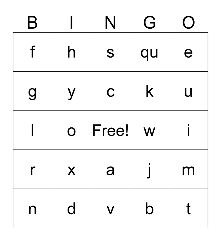 This bingo card has a free space and 26 words: a, b, c, d, e, f, g, h, i, j, k, l, m, n, o, p, qu, r, s, t, u, v, w, x, y and z.