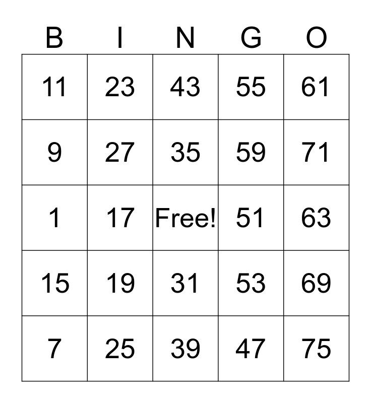 This bingo card has a free space and 24 words: 7, 19, 35, 47, 61, 11, 23, 43, 51, 63, 1, 27, 53, 69, 9, 25, 39, 55, 71, 15, 17, 31, 59 and 75.