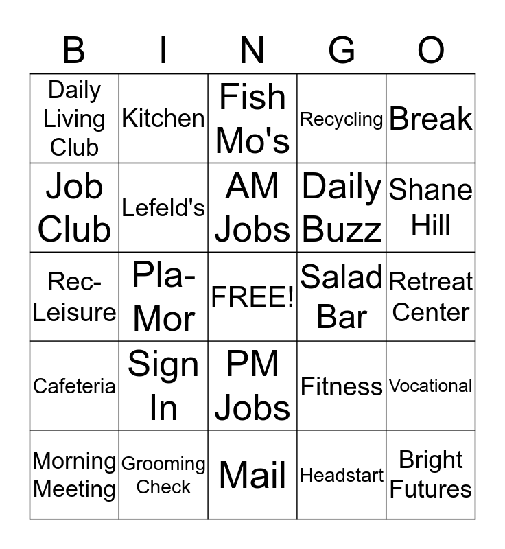 This bingo card has a free space and 24 words: Sign In, Grooming Check, AM Jobs, Morning Meeting, Break, Daily Living Club, Job Club, Kitchen, Salad Bar, PM Jobs, Daily Buzz, Rec-Leisure, Fitness, Vocational, Lefeld's, Headstart, Retreat Center, Fish Mo's, Shane Hill, Pla-Mor, Bright Futures, Cafeteria, Recycling and Mail.