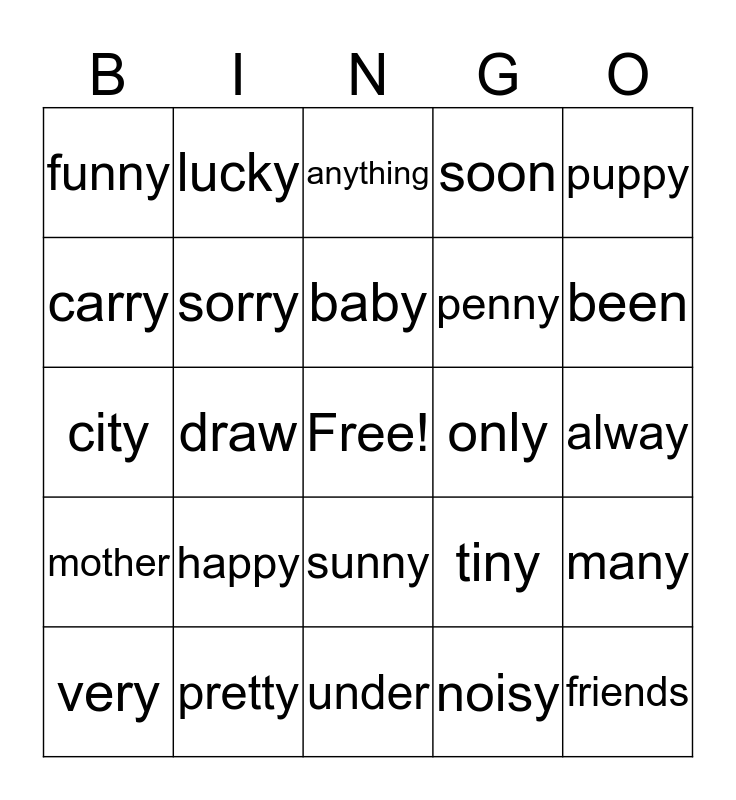 This bingo card has a free space and 24 words: happy, pretty, baby, very, puppy, funny, carry, lucky, only, sunny, penny, city, tiny, many, sorry, noisy, alway, anything, been, draw, friends, mother, soon and under.