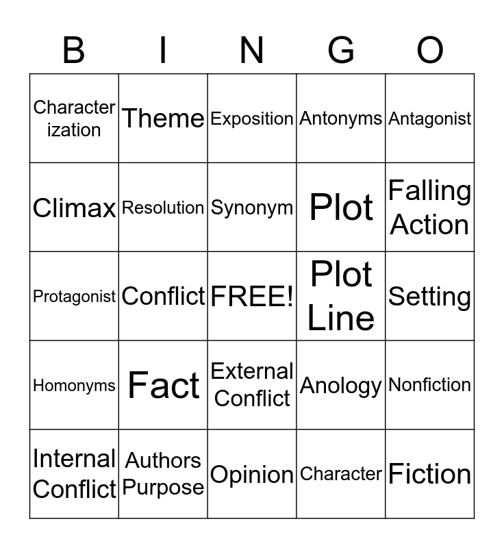 This bingo card has a free space and 24 words: Fact, Authors Purpose, Synonym, Internal Conflict, Antagonist, Character ization, Climax, Theme, Plot Line, External Conflict, Plot, Protagonist, Anology, Nonfiction, Resolution, Character, Setting, Exposition, Falling Action, Conflict, Fiction, Homonyms, Antonyms and Opinion.