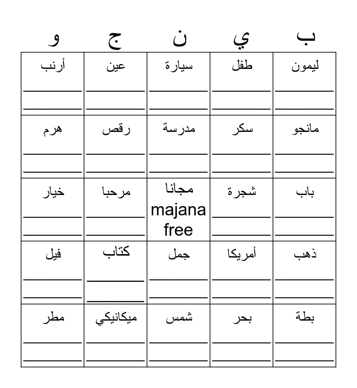 This bingo card has a free space and 24 words: كتاب ______ ______, ميكانيكي _______ _______, مدرسة _______ _______, مطر _______ _______, ليمون _______ _______, أرنب _______ _______, هرم _______ _______, عين _______ _______, شجرة _______ _______, جمل _______ _______, سكر _______ _______, خيار _______ _______, أمريكا _______ _______, ذهب _______ _______, رقص _______ _______, بحر _______ _______, باب _______ _______, سيارة _______ _______, مانجو _______ _______, مرحبا _______ _______, بطة _______ _______, فيل _______ _______, طفل _______ _______ and شمس _______ _______.