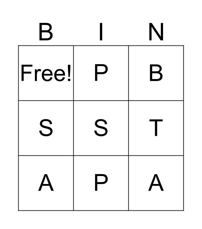 This bingo card has 9 words: A, B, P, S, Free!, T, S, A and P.