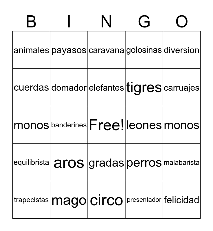 This bingo card has a free space and 24 words: aros, mago, elefantes, trapecistas, diversion, animales, cuerdas, payasos, leones, gradas, tigres, monos, perros, malabarista, domador, presentador, monos, caravana, carruajes, banderines, felicidad, equilibrista, golosinas and circo.