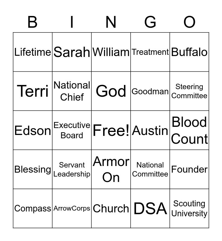 This bingo card has a free space and 24 words: Servant Leadership, ArrowCorps, God, Compass, Buffalo, Lifetime, Terri, Sarah, Austin, Armor On, Goodman, Edson, National Committee, Founder, National Chief, DSA, Blood Count, William, Steering Committee, Executive Board, Scouting University, Blessing, Treatment and Church.