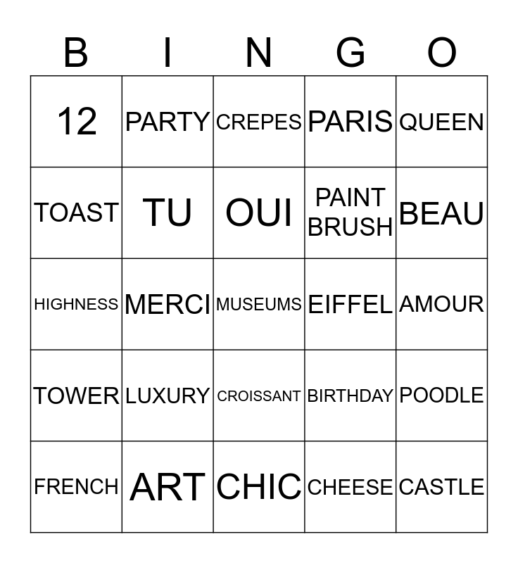 This bingo card has 25 words: LUXURY, CHIC, OUI, FRENCH, QUEEN, 12, TOAST, PARTY, EIFFEL, CROISSANT, PAINT BRUSH, HIGHNESS, BIRTHDAY, POODLE, TU, CASTLE, AMOUR, CREPES, BEAU, MERCI, MUSEUMS, ART, TOWER, PARIS and CHEESE.