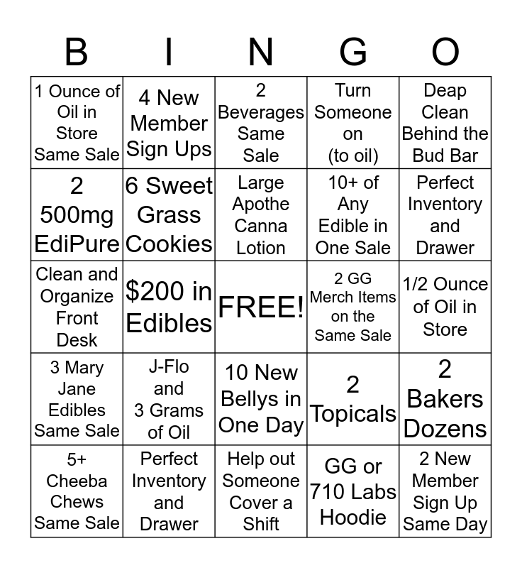 This bingo card has a free space and 24 words: J-Flo and 3 Grams of Oil, Perfect Inventory and Drawer, Large Apothe Canna Lotion, 5+ Cheeba Chews Same Sale, Deap Clean Behind the Bud Bar, 1 Ounce of Oil in Store Same Sale, 2 500mg EdiPure, 4 New Member Sign Ups, 2 GG Merch Items on the Same Sale, 10 New Bellys in One Day, 10+ of Any Edible in One Sale, Clean and Organize Front Desk, 2 Topicals, 2 Bakers Dozens, 6 Sweet Grass Cookies, GG or 710 Labs Hoodie, 1/2 Ounce of Oil in Store, 2 Beverages Same Sale, Perfect Inventory and Drawer, $200 in Edibles, 2 New Member Sign Up Same Day, 3 Mary Jane Edibles Same Sale, Turn Someone on (to oil) and Help out Someone Cover a Shift.