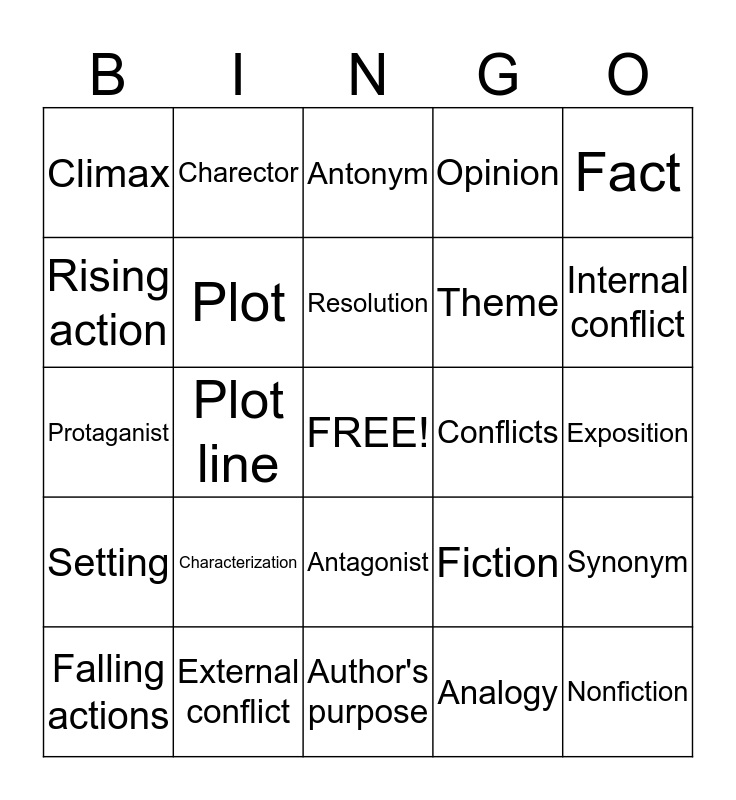 This bingo card has a free space and 24 words: Characterization, External conflict, Resolution, Falling actions, Fact, Climax, Rising action, Charector, Conflicts, Antagonist, Theme, Protaganist, Fiction, Synonym, Plot, Analogy, Exposition, Antonym, Internal conflict, Plot line, Nonfiction, Setting, Opinion and Author's purpose.