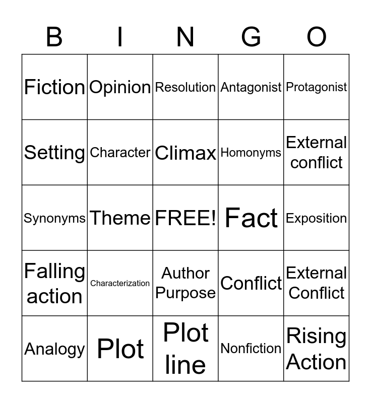 This bingo card has a free space and 24 words: Characterization, Plot, Climax, Analogy, Protagonist, Fiction, Setting, Opinion, Fact, Author Purpose, Homonyms, Synonyms, Conflict, External Conflict, Character, Nonfiction, Exposition, Resolution, External conflict, Theme, Rising Action, Falling action, Antagonist and Plot line.