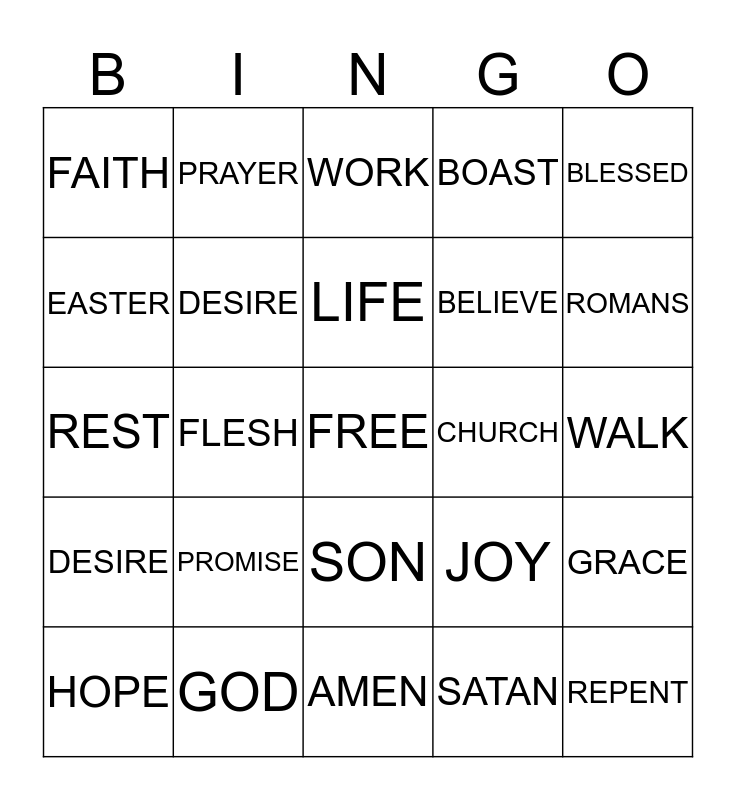 This bingo card has a free space and 24 words: PROMISE, GOD, LIFE, HOPE, BLESSED, FAITH, EASTER, PRAYER, CHURCH, SON, BELIEVE, REST, JOY, GRACE, DESIRE, SATAN, WALK, WORK, ROMANS, FLESH, REPENT, DESIRE, BOAST and AMEN.