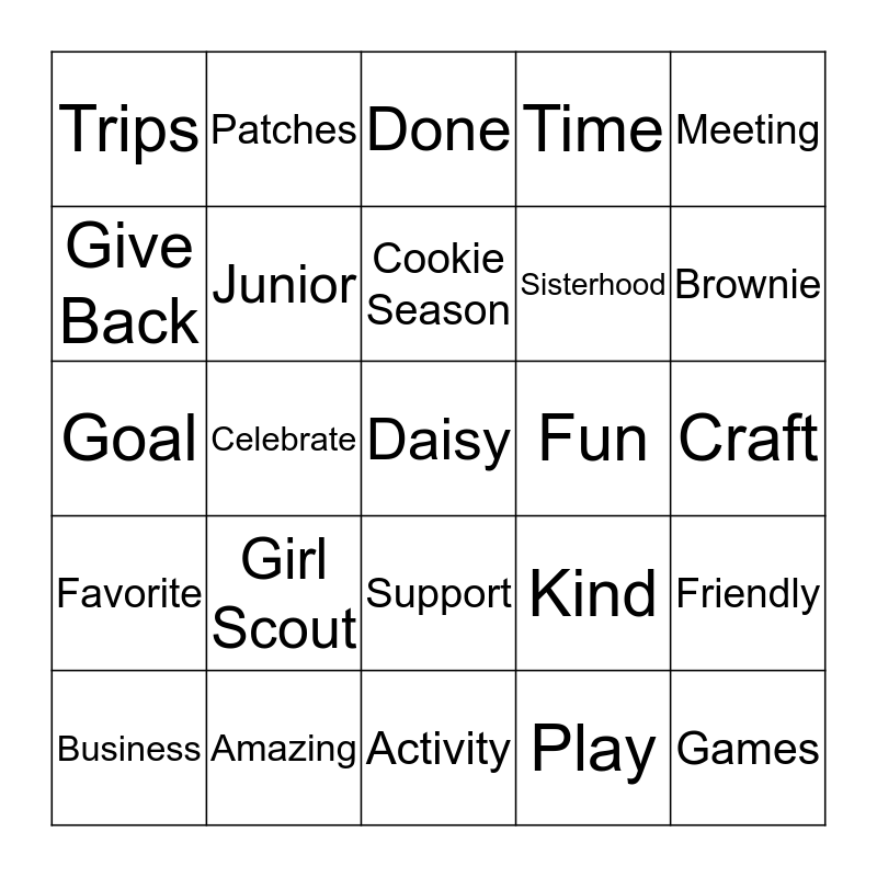 This bingo card has a free space and 24 words: Girl Scout, Amazing, Cookie Season, Business, Meeting, Trips, Give Back, Patches, Fun, Support, Sisterhood, Goal, Kind, Friendly, Junior, Play, Craft, Done, Brownie, Celebrate, Games, Favorite, Time and Activity.