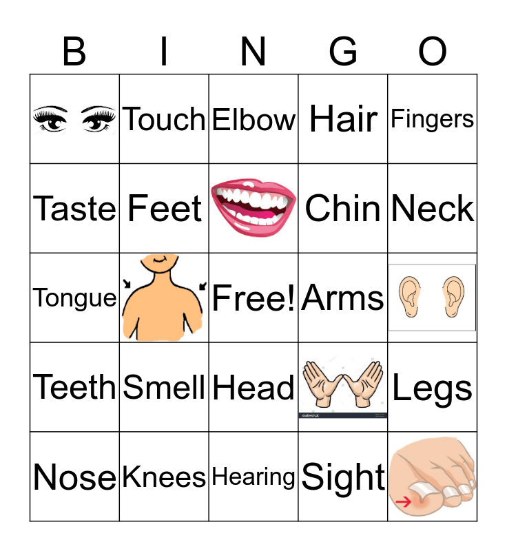 This bingo card has 6 images, a free space and 18 words: Nose, Smell, Sight, Fingers, Touch, Elbow, Arms, Tongue, Feet, Legs, Taste, Knees, Hearing, Hair, Neck, Teeth, Head and Chin.