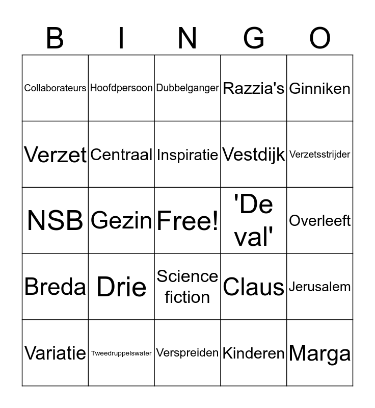 This bingo card has a free space and 39 words: Hoofdstuk, Vergeten, Dagboeken, Centraal, Variatie, Science fiction, Inspiratie, Verklaren, Ginniken, Breda, Gezin, Razzia's, Marga, Overleeft, 'De val', Drie, Vijand, Collaborateurs, Veroordeeld, Claus, Verzet, Verspreiden, Vestdijk, Verzetsstrijder, Genocide, Concentratiekampen, Oberski, Kampleven, Hongerwinter, Hoofdpersoon, Joods, Pleeggezin, Dubbelganger, Tweedruppelswater, Kinderen, Adolf Eichmann, Jerusalem, NSB and De aanslag.