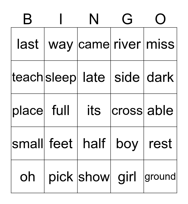 This bingo card has 25 words: feet, show, late, oh, miss, last, teach, way, cross, half, side, place, boy, rest, sleep, ground, able, came, dark, full, its, pick, small, river and girl.
