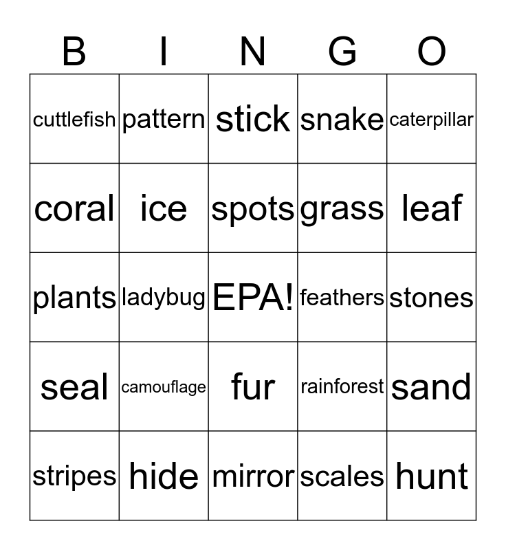 This bingo card has a free space and 24 words: camouflage, hide, spots, stripes, caterpillar, cuttlefish, coral, pattern, feathers, fur, grass, plants, rainforest, sand, ice, scales, stones, stick, leaf, ladybug, hunt, seal, snake and mirror.