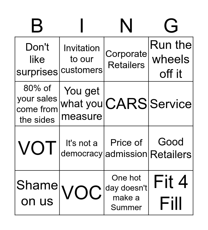 This bingo card has 16 words: VOC, Good Retailers, Corporate Retailers, Don't like surprises, VOT, Invitation to our customers, Price of admission, One hot day doesn't make a Summer, 80% of your sales come from the sides, You get what you measure, Shame on us, Run the wheels off it, It's not a democracy, Service, CARS and Fit 4 Fill.