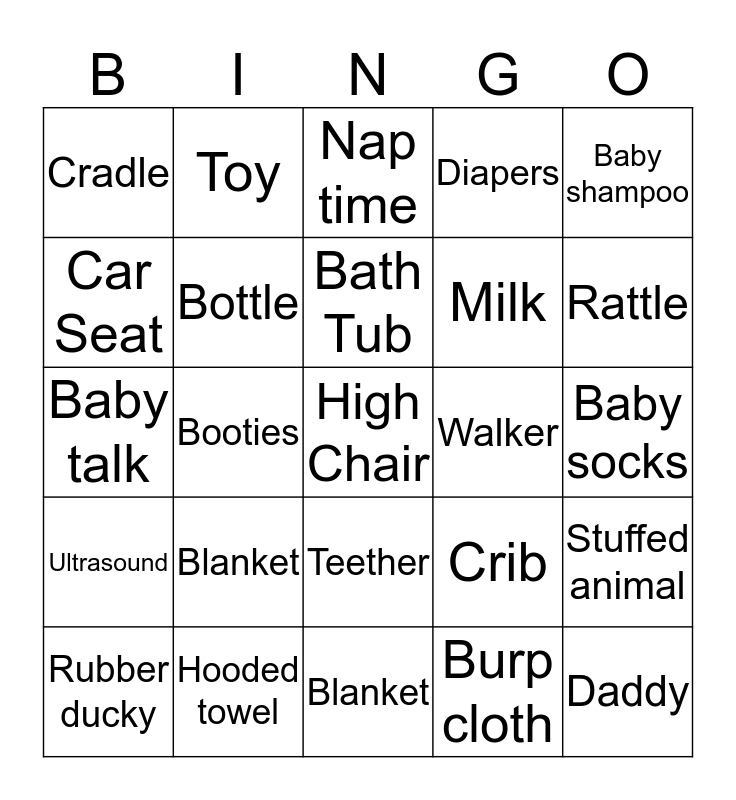 This bingo card has 47 words: Free!, High Chair, Onesies, Blanket, Blanket, Swing, Toy, Bib, Car Seat, Pacifier, Bottle, Diapers, Stuffed animal, Crib, Books, Bedding, Bath Tub, Walker, Wipes, Baby shampoo, Booties, Burp cloth, Cradle, Milk, Nursery, Rattle, Rubber ducky, Stroller, Teether, Ultrasound, Nappy, Baby Lotion, Spoon, Safety Pin, Lullaby, Hooded towel, Baby socks, Bouncy seat, Nail clippers, Baby monitor, Daddy, Nap time, Baby talk, Play yard, Family, Mommy and Diaper bag.