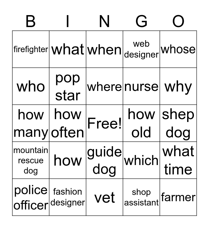 This bingo card has a free space and 24 words: how, fashion designer, where, police officer, whose, firefighter, who, what, how old, guide dog, nurse, how many, which, what time, pop star, shop assistant, shep dog, when, why, how often, farmer, mountain rescue dog, web designer and vet.