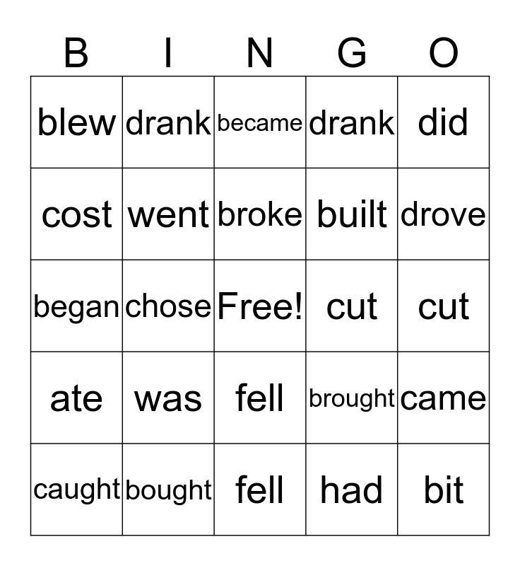 This bingo card has a free space and 24 words: was, bought, broke, caught, did, blew, cost, drank, cut, fell, built, began, brought, came, went, had, cut, became, drove, chose, bit, ate, drank and fell.