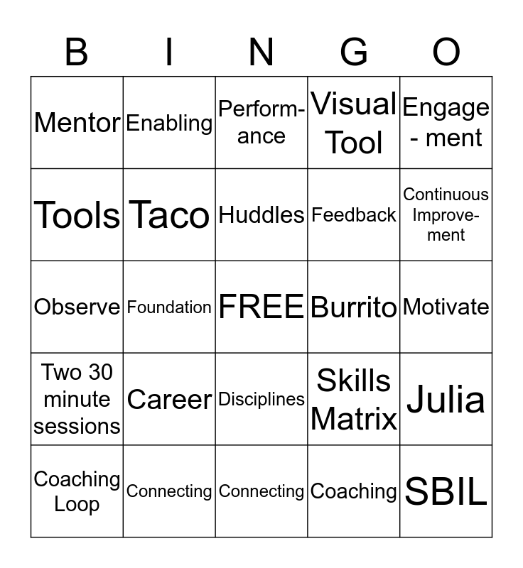 This bingo card has a free space and 24 words: Career, Connecting, Huddles, Coaching Loop, Engage - ment, Mentor, Tools, Enabling, Burrito, Disciplines, Feedback, Observe, Skills Matrix, Julia, Taco, Coaching, Motivate, Perform- ance, Continuous Improve-ment, Foundation, SBIL, Two 30 minute sessions, Visual Tool and Connecting.
