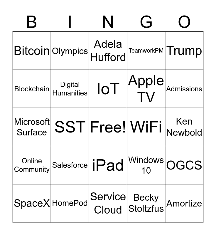 This bingo card has a free space and 24 words: Salesforce, HomePod, IoT, SpaceX, Trump, Bitcoin, Blockchain, Olympics, WiFi, iPad, Apple TV, Microsoft Surface, Windows 10, OGCS, Digital Humanities, Becky Stoltzfus, Ken Newbold, Adela Hufford, Admissions, SST, Amortize, Online Community, TeamworkPM and Service Cloud.