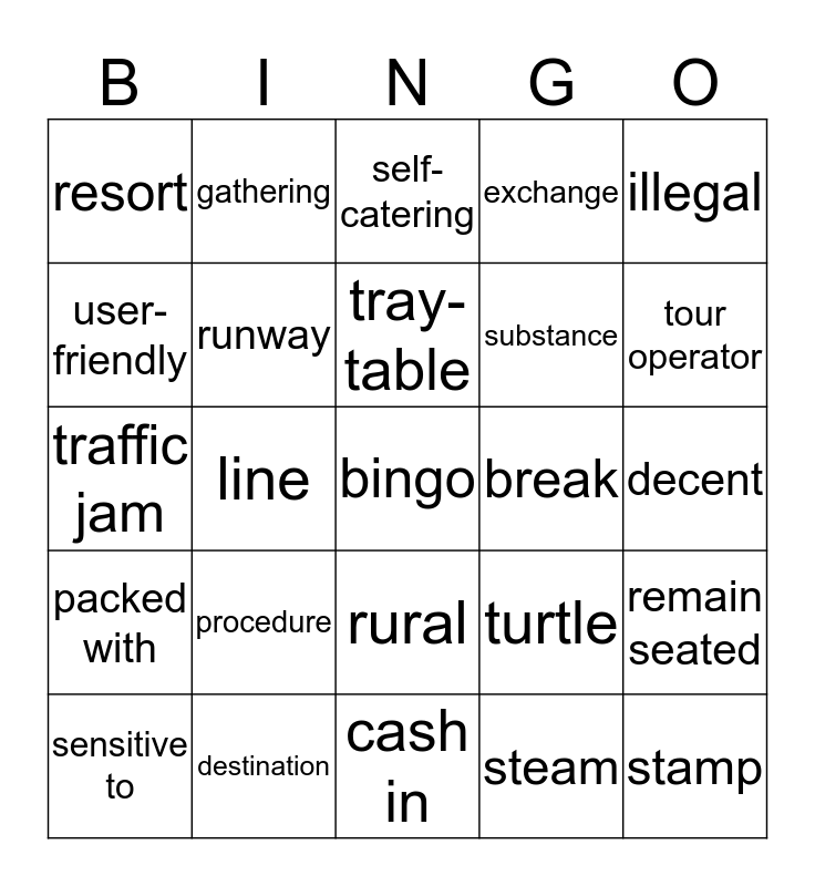 This bingo card has a free space and 38 words: apologise, divert, air traffic, runway, remain seated, procedure, tray-table, declare, illegal, substance, line, exchange, stamp, decent, user-friendly, packed with, hostel, self-catering, bed and breakfast, break, resort, destination, tour operator, sensitive to, travel company, cash in, contribution, self-esteem, pitch, currency, further, rural, steam, gathering, shore, turtle, traffic jam and in peace.