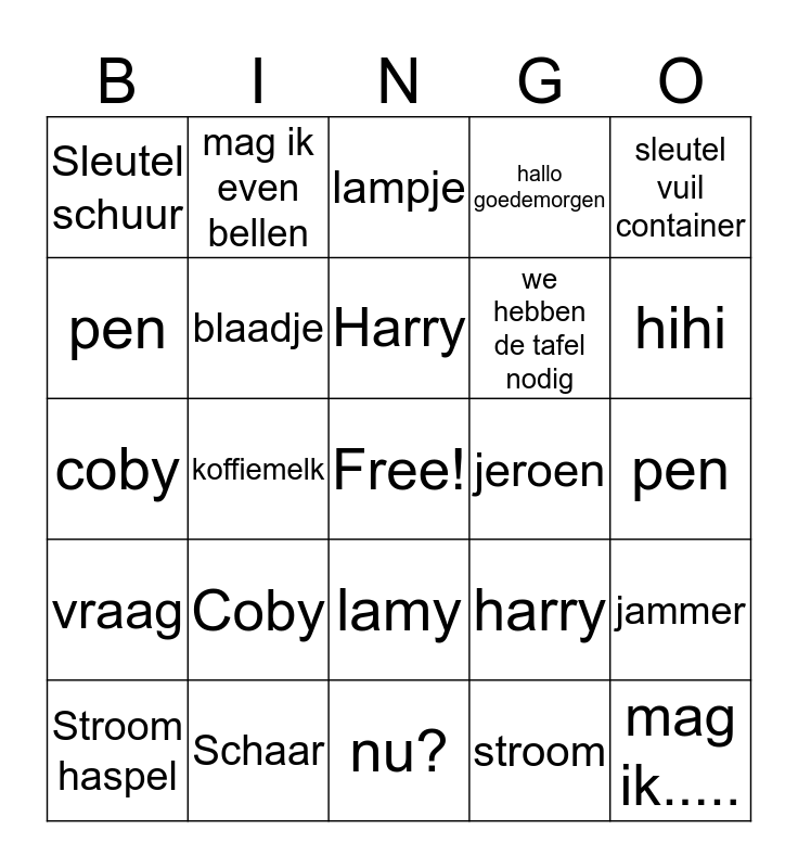 This bingo card has a free space and 24 words: Coby, Schaar, Harry, Stroom haspel, sleutel vuil container, Sleutel schuur, pen, mag ik even bellen, jeroen, lamy, we hebben de tafel nodig, coby, harry, jammer, blaadje, stroom, pen, lampje, hihi, koffiemelk, mag ik....., vraag, hallo goedemorgen and nu?.