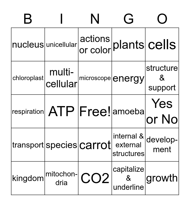This bingo card has a free space and 24 words: species, mitochon-dria, microscope, kingdom, cells, nucleus, chloroplast, unicellular, amoeba, carrot, energy, respiration, internal & external structures, develop-ment, multi-cellular, capitalize & underline, Yes or No, actions or color, structure & support, ATP, growth, transport, plants and CO2.