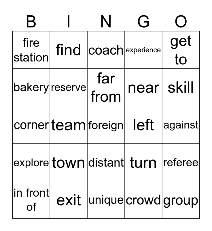This bingo card has a free space and 24 words: town, exit, far from, in front of, get to, fire station, bakery, find, left, distant, near, corner, turn, referee, reserve, crowd, against, coach, skill, team, group, explore, experience and unique.