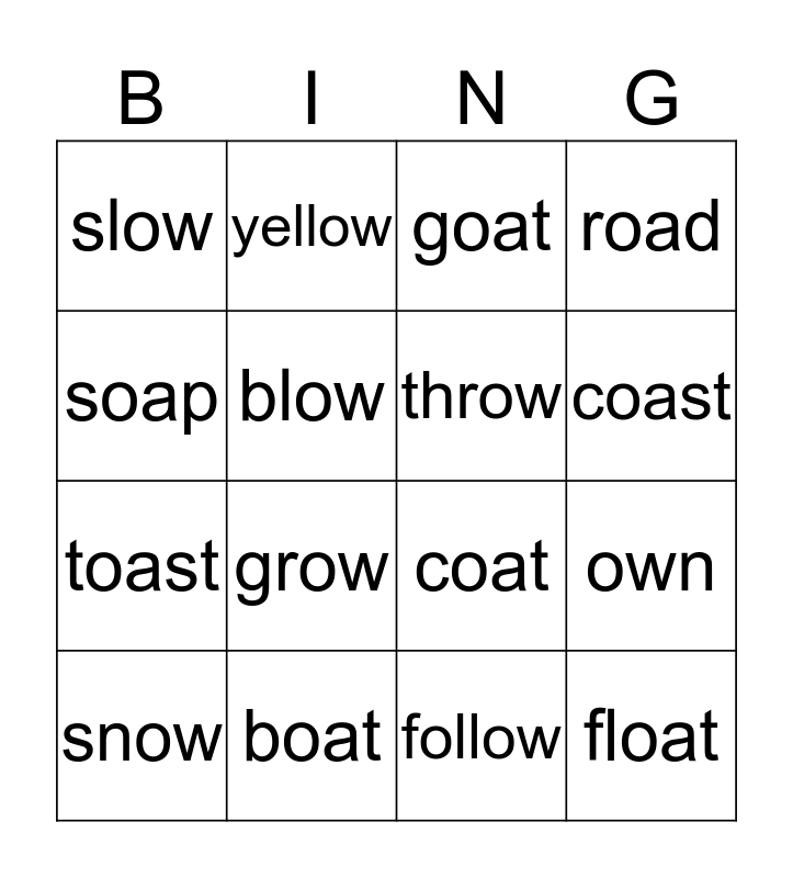This bingo card has 16 words: boat, own, goat, slow, toast, yellow, coat, follow, soap, blow, snow, road, grow, coast, throw and float.